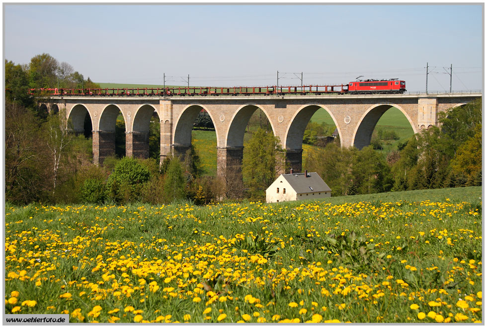 155 127 rauscht am Mittag des 06.05.11 mit dem leeren Autozug über das Wegefarther Viadukt, hoch über unzähligen blühenden Maistöcken.