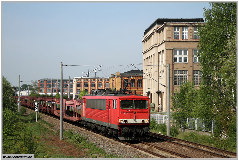 Am 29.04. hat 155 259 Dienst am CSQ47309 und ist hier gerade im Stadtteil Chemnitz-Schönau mit seiner erhaltenen historischen Industriearchitektur unterwegs.