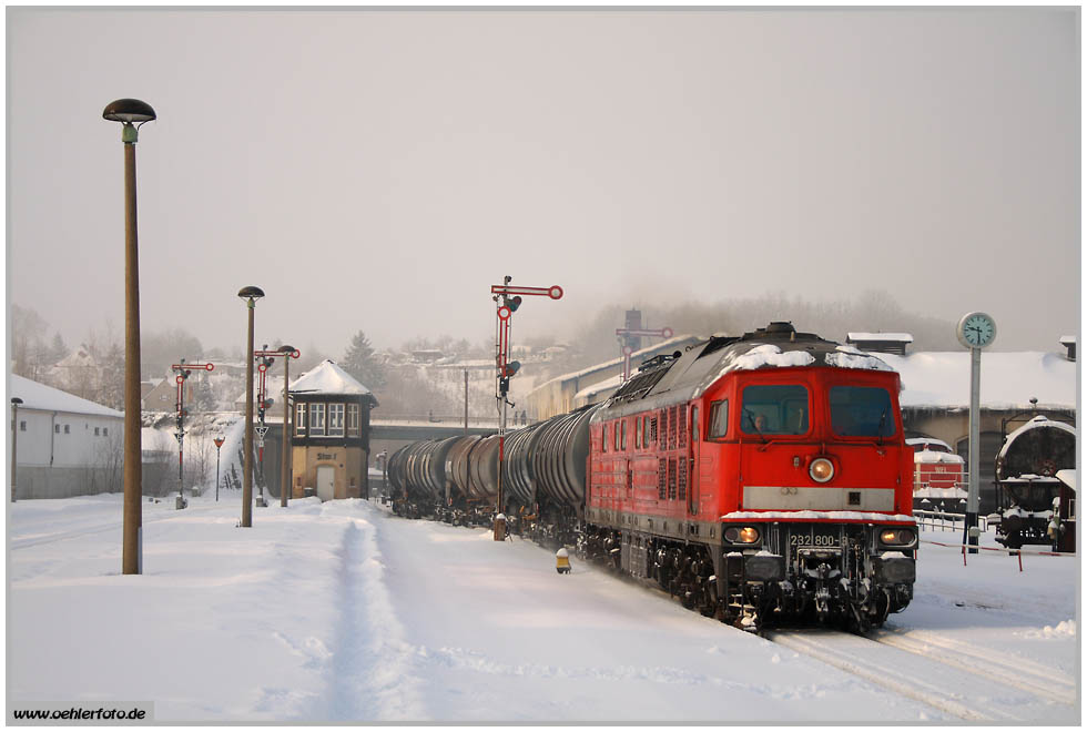 Am Morgen des 29.12.10 ist die Wintersonne gerade dabei sich den Weg durch den Eisnebel zu bahnen, als 232 800 mit dem ersten Leerzug CS60956 vom GTL Rhäsa in den tief verschneiten Nossener Bahnhof einfährt. Dieses Bild gehört zu meinen persönlichen Lieblingsaufnahmen.