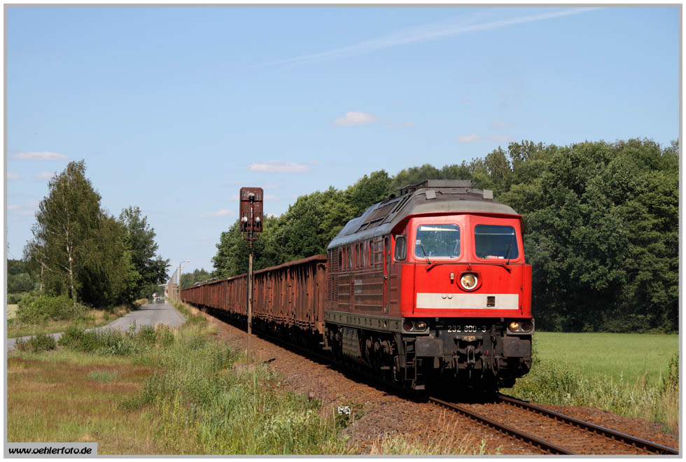 Am Abend des 17.06.11 bespannte 232 800 einen Schotterzug ab dem Grauwackewerk Oßling. Hier hat der Zug gerade den Werkbahnhof Oßling verlassen.