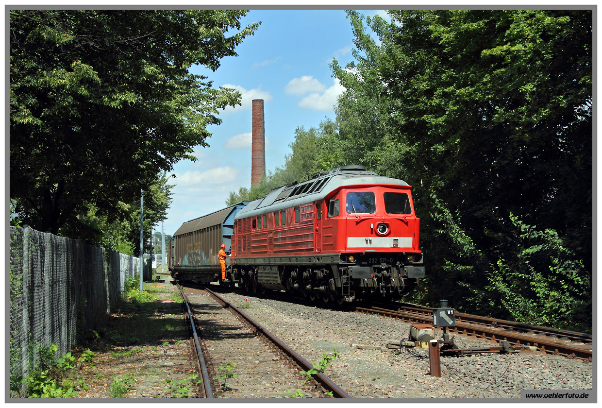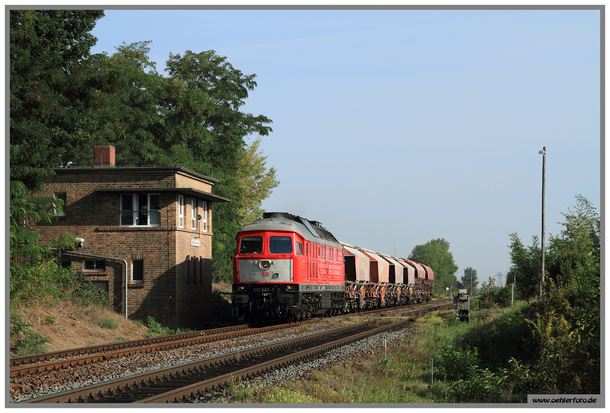 Am brütendheißen Nachmittag des 26.08.11 rangiert 232 413 im Bahnhof Großsteinberg ihren Kieszug zusammen.
