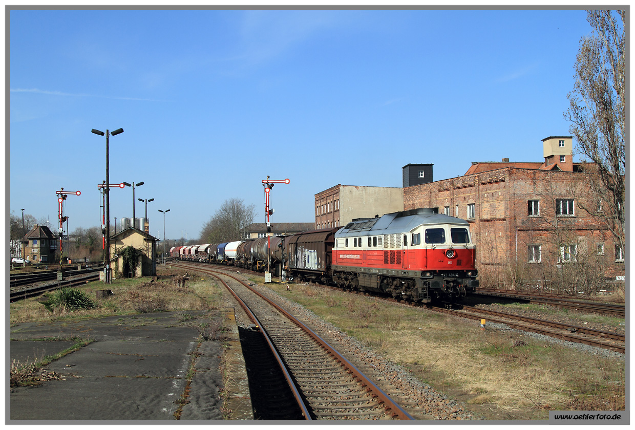 Am Nachmittag des 11.03.2014 gab es ein fotografisches "Schmankerl" - die frisch in Cottbus untersuchte 232 254 rauscht mit dem Bedarfskohlependel GM60032 Dessau-Profen durch den ehemaligen Bahnhof von Pegau im Leipziger Braunkohlerevier und strahlt dabei mit der Sonne um die Wette.
