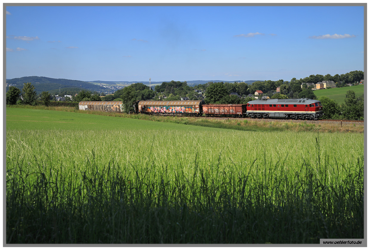 Vom 24. bis 27. Juni war die Hauptstrecke zwischen Großkorbetha und Weißenfels aufgrund von Bauarbeiten gesperrt. Die Güterzüge der Relation Halle-Saalfeld wurden daher über Zeitz und Gera umgeleitet und von Loks der Baureihe 232/233 bespannt. Am letzten Tag der Umleitung konnte auch hier 232 908 mit dem EZ51647 von Halle nach Saalfeld kurz hinter Niederpöllnitz aufgenommen werden. Einige dort noch vorhandene Telegrafenmasten sorgen für nostalgisches Ambiente.