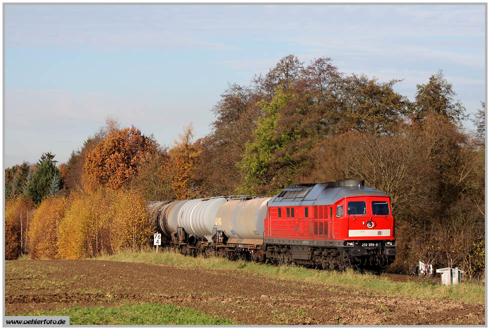 232 359 ist am schönen 07.11.2009 mit dem ersten samstäglichen Leerzug vom GTL Rhäsa nach Coswig unterwegs, hier kurz vor Deutschenbora fotografiert. Zu diesem Foto gehört noch eine Geschichte. Just an diesem Vormittag gab mein Normalzoomobjektiv den Geist auf. Zum Glück hatte ich auch noch das Tele mit. Somit musste ich etwas weiter auf das Feld hinauslaufen, um das Foto irgendwie mit einer Teleeinstellung noch realisieren zu können. Daher dieser vielleicht etwas ungewohnte Blick auf diese bekannte Fotostelle.