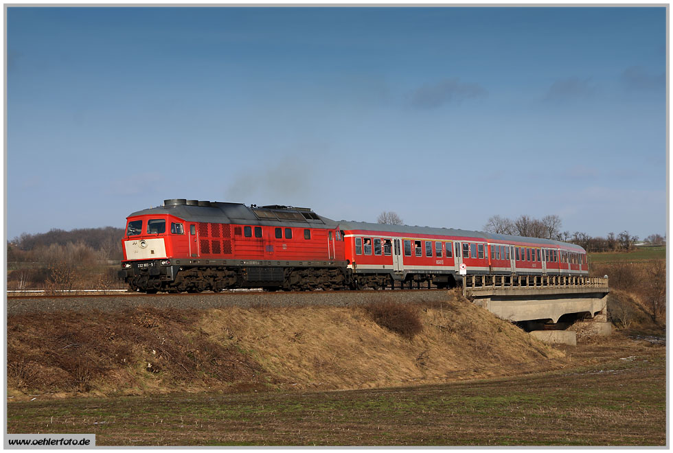 Am 22.01.2011 kam erstmals 232 903 vor den RE´s in Thüringen zum Einsatz. Hier befährt sie mit RE3632 nach Erfurt die Pleiße-Flutbrücke am Abzweig Saara.