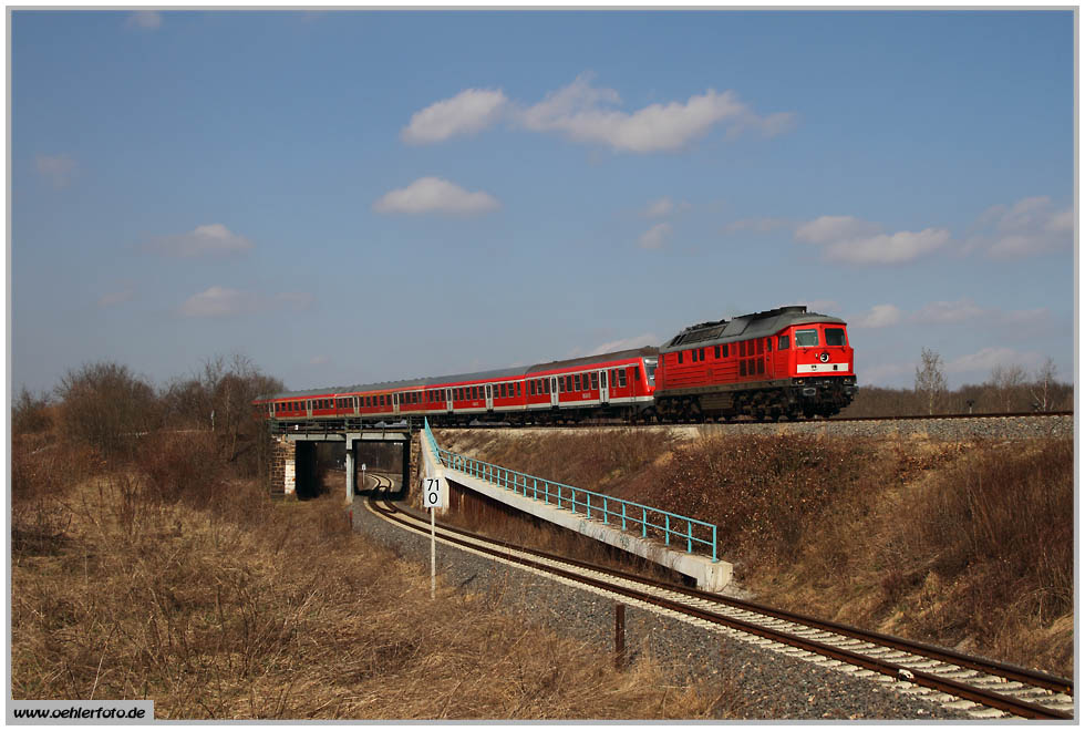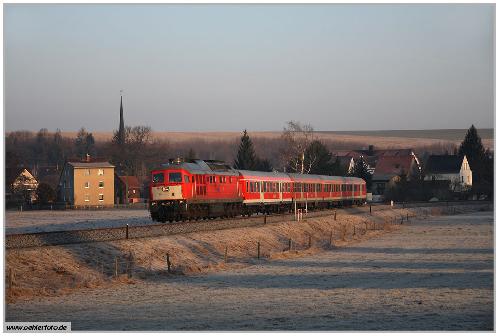 Am Morgen des 04.03.2011 hat sich die Sonne gerade erst durch den Dunst gekämpft, als 232 413 mit RE3323 zwischen Großstöbnitz und Lehndorf der Skatstadt Altenburg entgegen eilt.