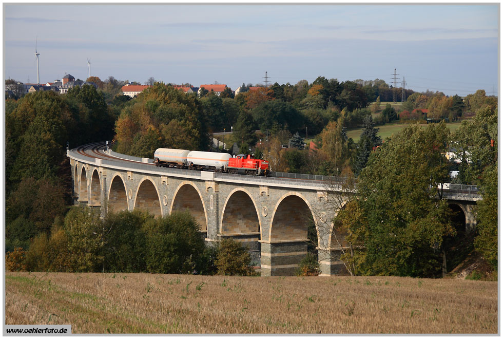 Unerkannt blieb am 04.11.11 diese Lok der Baureihe 294, welche mit der Übergabe aus Plauen-Zellwolle gerade die bekannte Elstertalbrücke im Vogtland befährt.